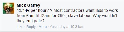 Mick Gaffey said on the social media website that most contractors want lads to work from 6am until 12am for €90 and said it was slave labour.