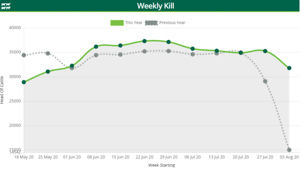 Secondly, the drop of 3,460 head compared to the week previous can be attributed to the August bank holiday Monday last week – although some factories did have a Saturday kill to maintain throughput.