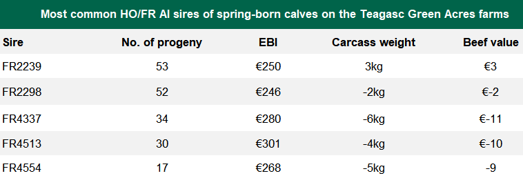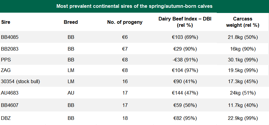 Eight continental bulls had >5 progeny on any of the Teagasc Green Acres farms (seven AI bulls, one stock bull). The DBI and carcass weight data of these bulls is outlined in the table (below).