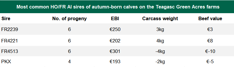 FR2239, FR4221, FR4513 and PKX are the four most common AI sires for the autumn cohort, although the number of progeny off all of these bulls is relatively low.