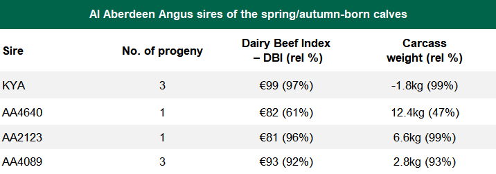 The Dairy Beef Index (DBI) of this sub-set of animals averaged €73 (38% reliability), while their carcass weight figures averaged 5.3kg (42% reliability). The AI sires with progeny present are: KYA; AA4089; AA4640; and AA2123.