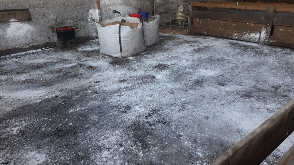 Shaking dry disinfectant or lime on the existing bedding prior to renewing it with fresh straw can help prevent diseases such as lameness.