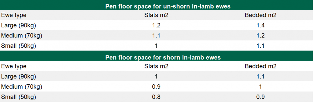 This table (below) outlines the minimum floor space ewes of different weight categories require.