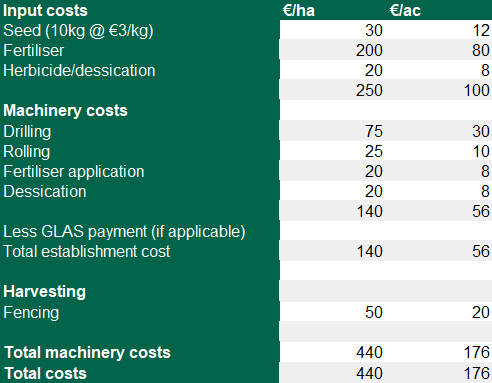 All costs are considered in the figures above, including: sowing; fertiliser and the plastic to wrap when baled. Where it is intended to graze the crop, harvesting costs should be replaced by fencing and water costs.