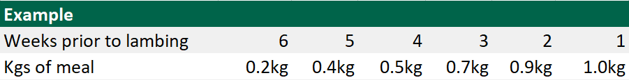 It is very important to feed a higher protein ration/pellet to ewes with a lambing percentage of 1.8 or higher. Please see the table below for feeding recommendations for ewes carrying twins: