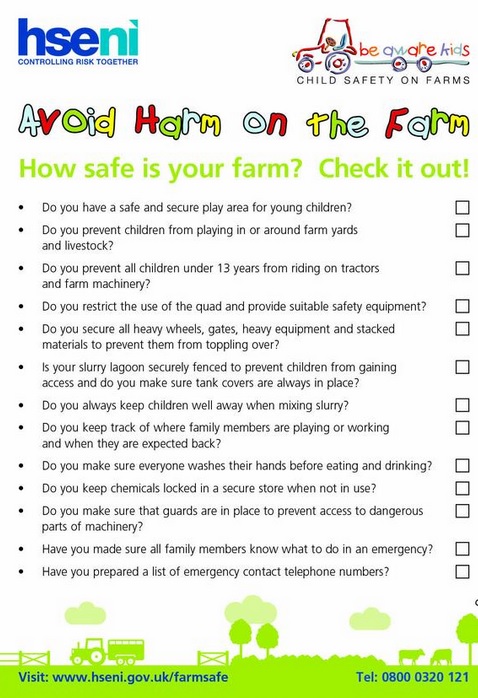 The Health and Safety Executive for Northern Ireland (HSENI) has a check-list to avoid harm on the farm.