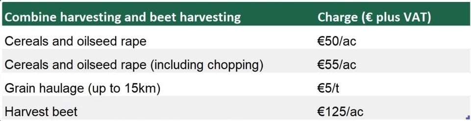 Below is an excerpt showing the rates for cereal and beet harvesting.