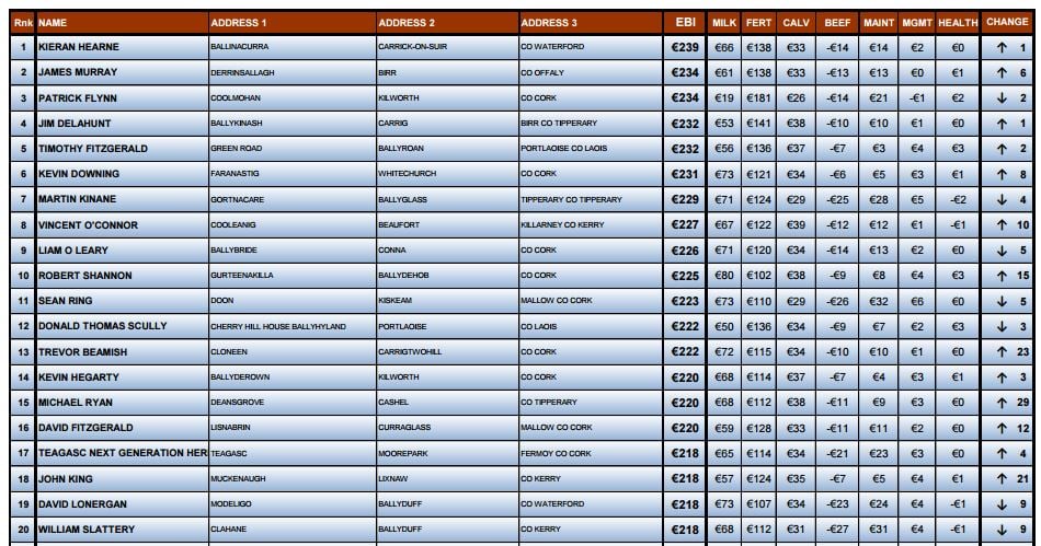 Jim Delahunt, Carrig, Co. Tipperary has climbed one position to fourth with an EBI of €232, while Timothy Fitzgerald, Green Road, Ballyroan, Portlaoise, Co. Laois claims fifth position with an EBI of €232.