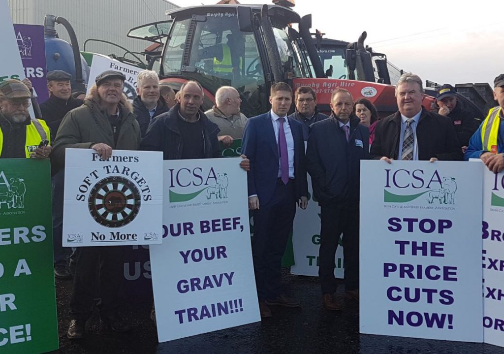 The protest has been organised by the Irish Cattle and Sheep Farmers’ Association (ICSA) who say that farmers in the beef sector have been “crucified by beef price cuts” in a year when farmers have substantial extra costs due to extreme weather.