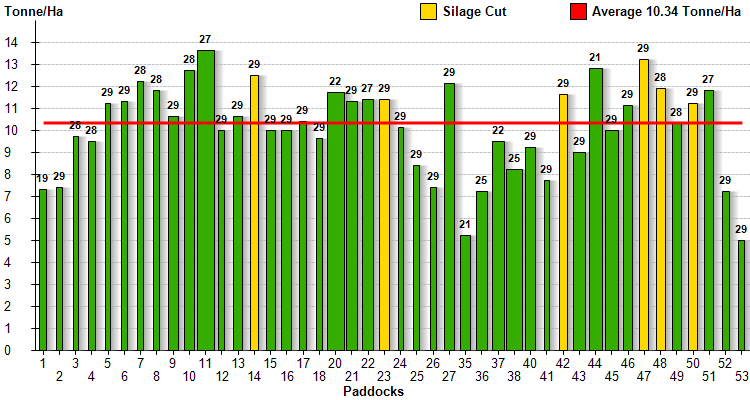 Most grass measurement software tools will compile and aggregate weekly growth rate date for each paddock on the farm and make this information available in a graphic bar chart format. At a glance it is easy to see the total tonnage grown in each paddock and more importantly, the often large variation in tonnage grown between paddocks.