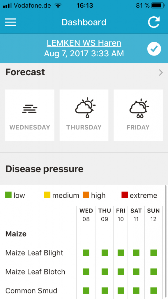 Aside from telling farmers what conditions in a particular field are like for spraying, the app also estimates disease pressure within a crop.