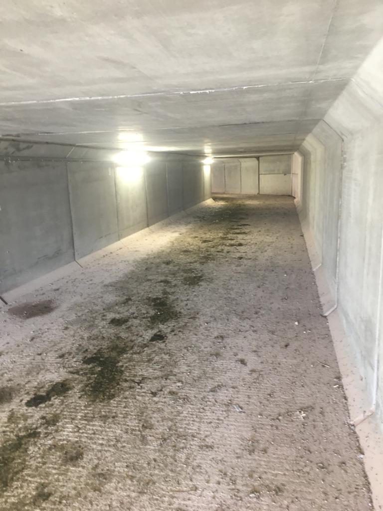 The entrance – at either side of the tunnel – is sloped with a concrete surface. At either end of the tunnel, there are two tanks that collect the slurry that builds up inside the tunnel.