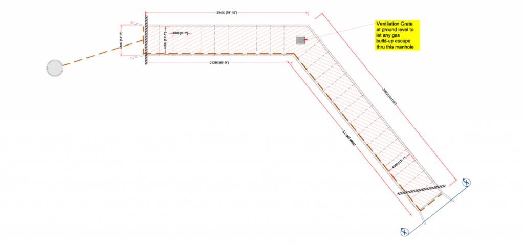 The entrance – at either side of the tunnel – is sloped with a concrete surface. At either end of the tunnel, there are two tanks that collect the slurry that builds up inside the tunnel.