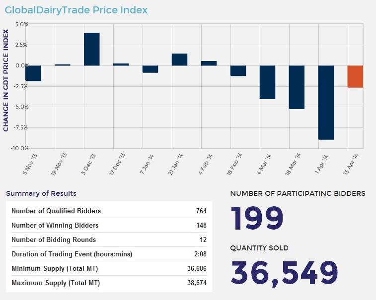 The auction represents the fifth consecutive auction, that milk prices have fallen while volumes also dropped in the latest sale held by New Zealand’s Fonterra Co-operative Group, the world’s biggest dairy exporter.