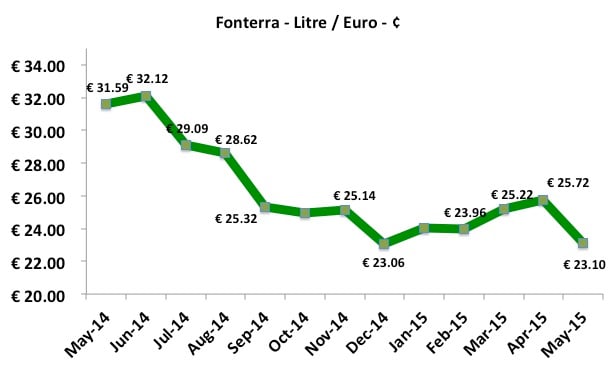 Fonterra’s forecast cash pay-out prices (Milk Price Plus Dividend) remained unchanged from December 10 2014 to April 30. A strengthening Kiwi dollar help show an increase in milk price value when converted into euros. At the end of April Fonterra dropped this forecast prices NZ$4.80 per KG of Milk Solids, which is equivalent to 23.10c/L.