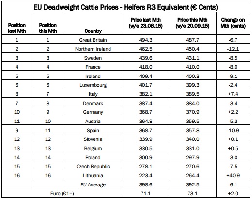 Looking to Northern Ireland, the LMC said that for the week ending September 20, the average R3 heifer price was the equivalent of 450.4c/kg, back 12.1c/kg from 462.5c/kg in the week ending August 23, 2015.