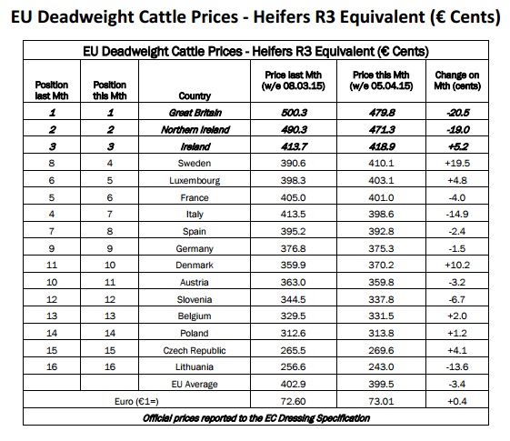 Northern Ireland continues to retain it,s second place spot on the EU cattle price league table with the average R3 heifer price for the week ending April 5 was the equivalent of 471.3c/kg.