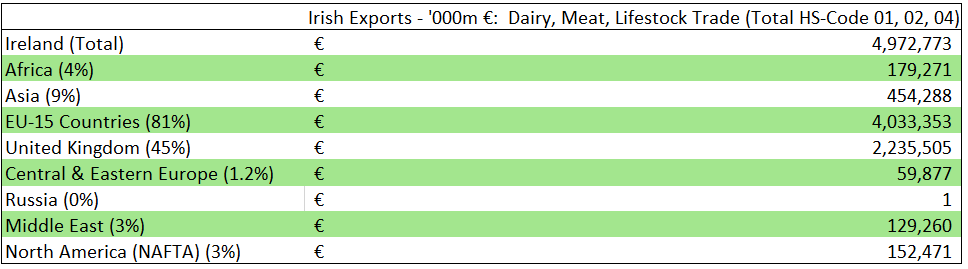 Ireland’s dairy and livestock food trade figures paint an alarming picture of an over-dependence on the British market. 45% of Ireland’s €4.9 billion of livestock, meat, and dairy-related exports in 2016 were destined for the UK.