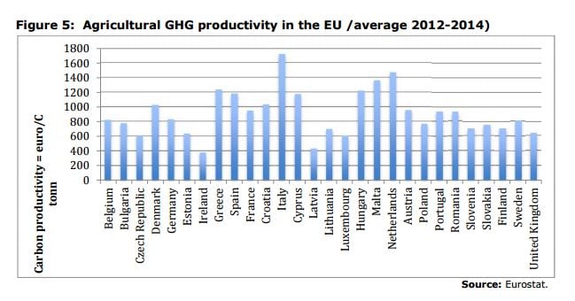 The best-performing country in the EU, Italy, achieved some €1,700 of agricultural output per tonne of emissions, the report shows.