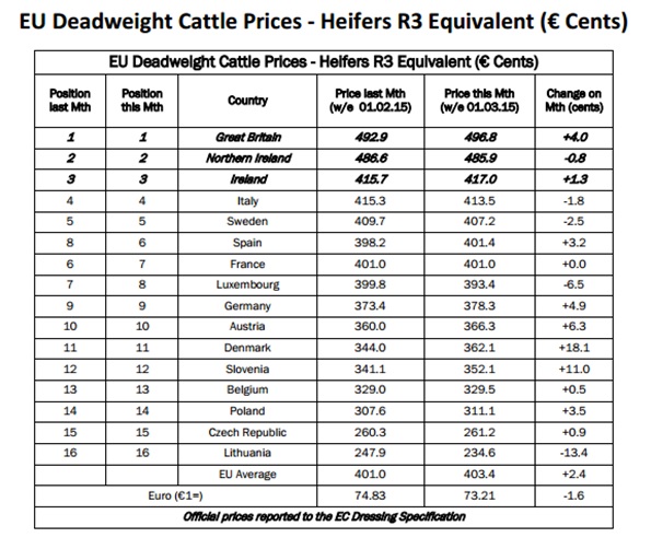 Northern Ireland continues to retain its second place spot on the EU league table with the average R3 heifer price the equivalent of 485.9c/kg for the week ending March 1, 2015. This price is down 0.8c/kg from 486.6c/kg in the week ending February 1, 2015.