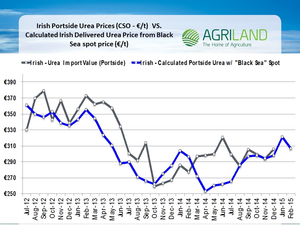 We see a strong correlation between CSO urea figures and calculated ‘spot market’ prices were the product to be delivered portside in Ireland.