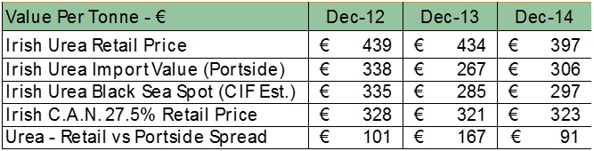 Which brings us back to Ireland. Two interesting issues arises when you look at available urea data. Firstly, as shown in the table below, there is a large variation in the year-on-year price difference between the price at which urea is landed portside in Ireland and the actual retail price paid by farmers.