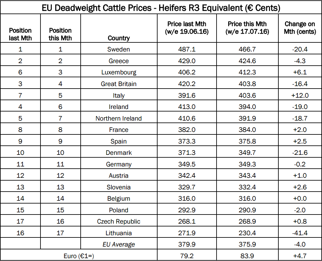 Britain dropped from fourth to third in the league table, with an equivalent R3 heifer price of 403.8c/kg on the week ending July 17, 2016.