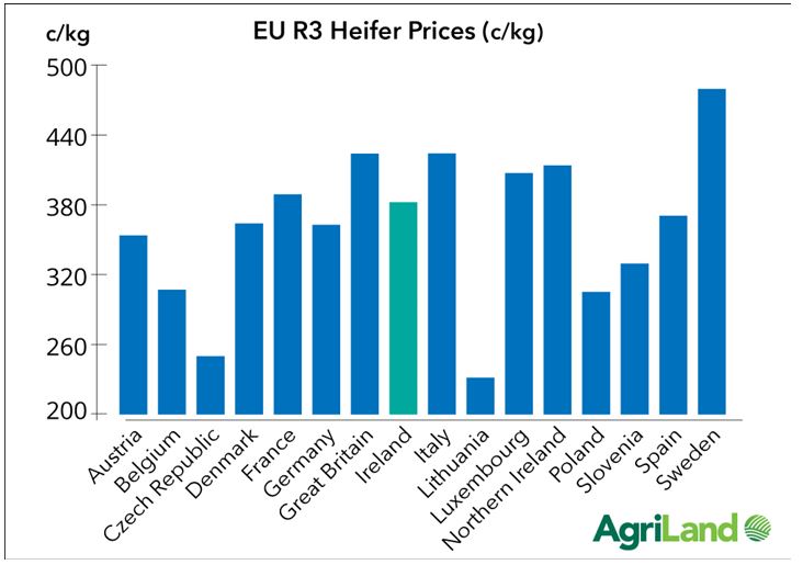 Northern Ireland also dropped from third to fourth position in the table, while the Republic of Ireland managed to climb from eight to seventh position in the EU heifer price league table.
