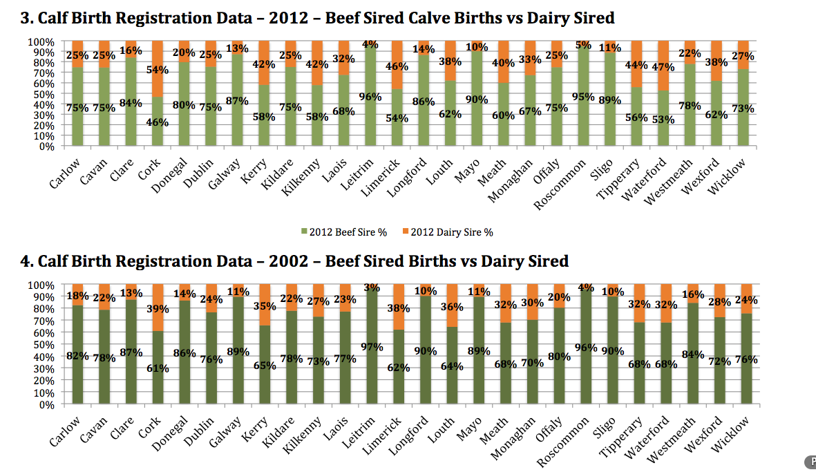 Munster and Leinster post strong gains here. In 2002, 33 per cent of calf births in Munster were to a dairy sire. This has jumped to 45 per cent in 2012. The largest changes were seen in the counties of Cork, Tipperary and Waterford, see supporting graphs attached.