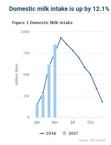 During the month of April, domestic milk intake by creameries and pasteurisers was estimated at 853.1 million litres, CSO figures show. In April 2016, this figure equated to 760.8 million litres.