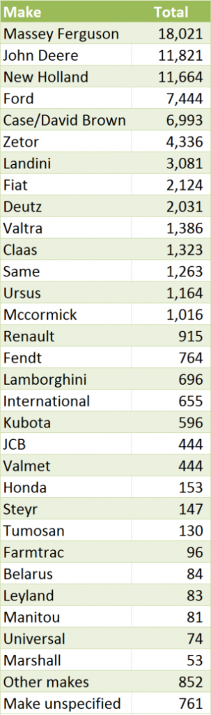 The ‘other makes‘ category accounts for 852 tractors. One can only wonder what oddities reside there, given that the list of makes/brands appears to be quite comprehensive.