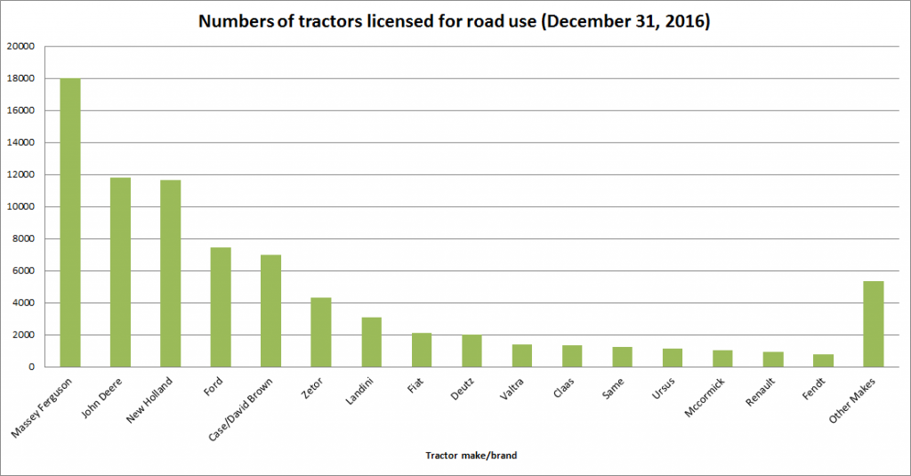 The table below shows the numbers of tractors (by make/brand), based on the numbers licensed for use on Irish roads on December 31, 2016. Again, the data is from the Department of Transport, Tourism and Sport.