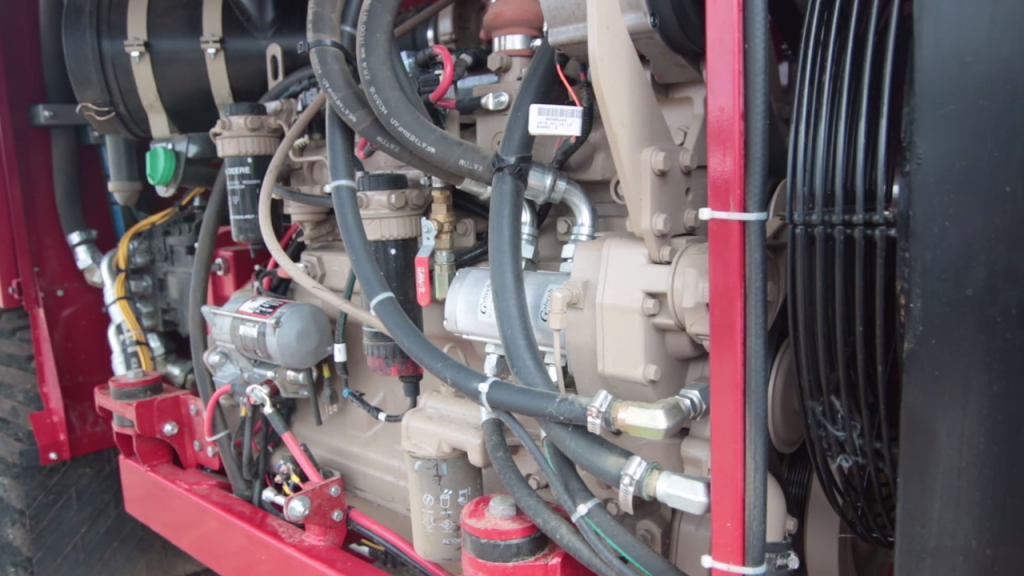 The Bale Baron is powered by a 173hp John Deere 6.8L, turbo-charged, 6-cylinder engine and has an in-field pick-up speed of 19kph. On the road, the max speed rises to 48kph.