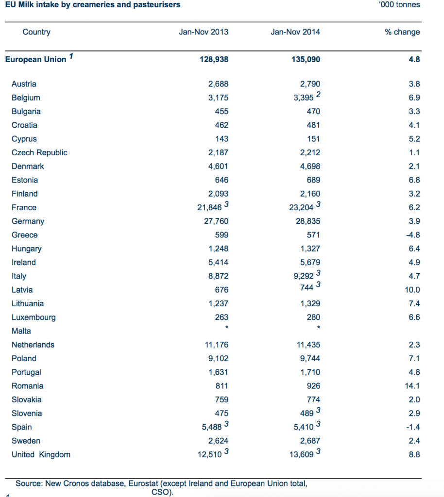 The figures from the CSO also show milk intake volumes across the EU in the January – November period of 2014, and every country in the EU, bar Greece and Spain increased their dairy production in 2014.