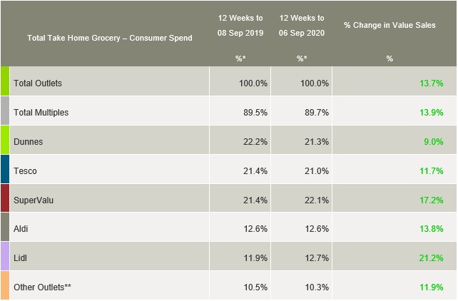 Take-home grocery sales growth in Ireland slowed to 13.7% year on year during the 12 weeks to Sunday, September 6, 2020, the latest figures from Kantar reveal.