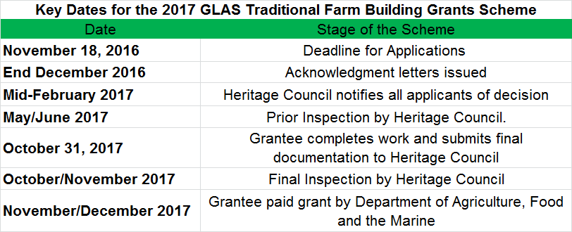 A full list of the terms and conditions of the 2017 GLAS Traditional Farm Buildings Scheme is available on the Heritage Council’s website.