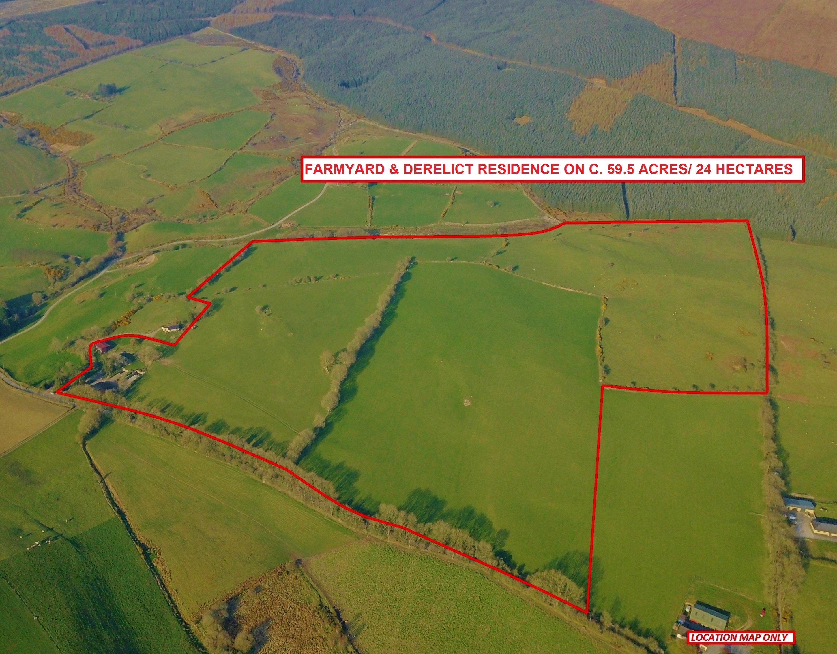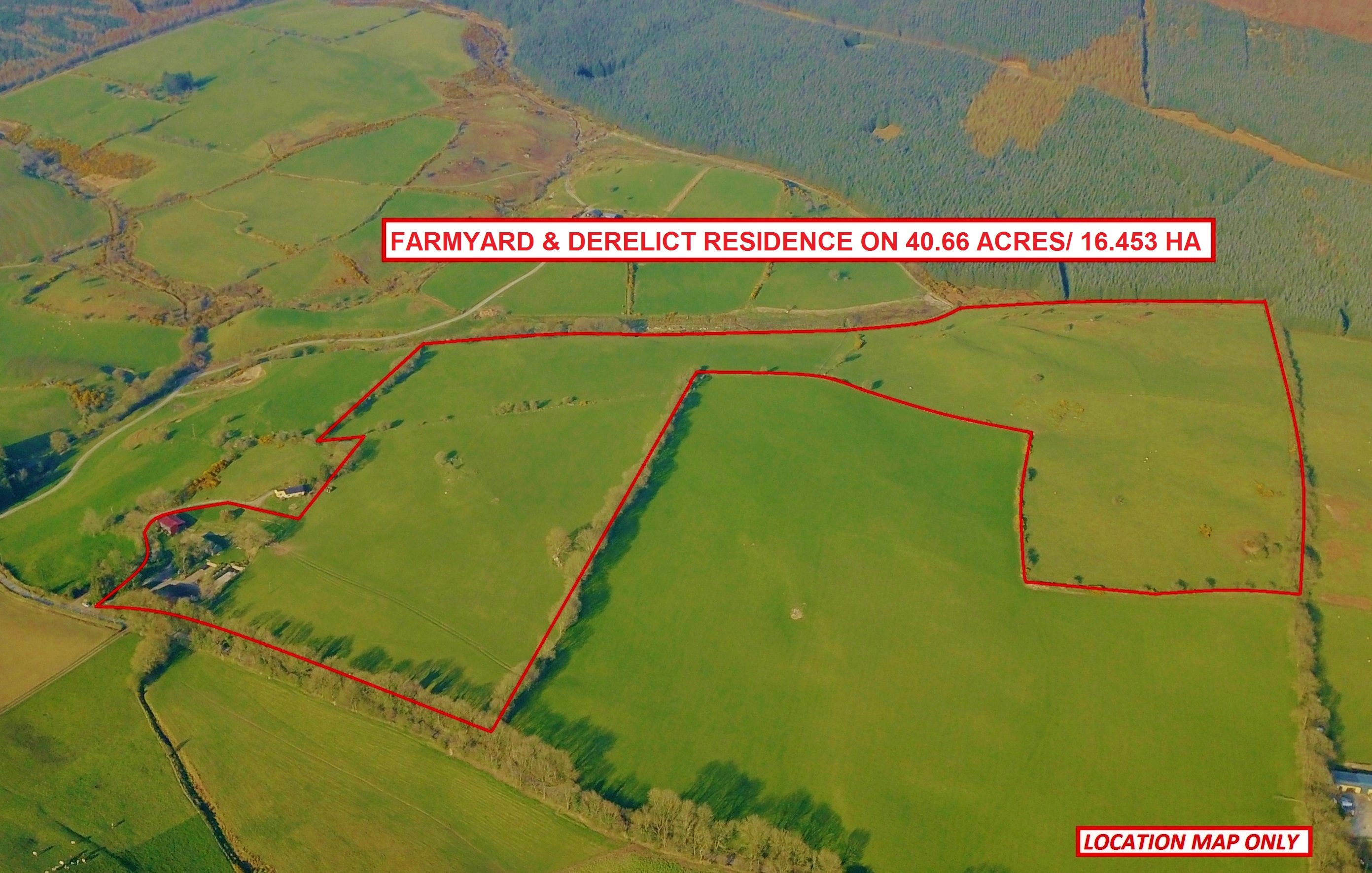 The farm is for sale in two lots. Lot 1, which comprises the farmyard and derelict residence on circa 40.66ac/16.453ha, is for sale in the region of €395,000.
