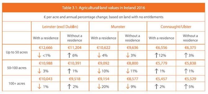 In 2016, selling prices in Munster for larger holdings – over 100ac with a residence – fell by 20%, while those without a dwelling fell by 9%, the report found.