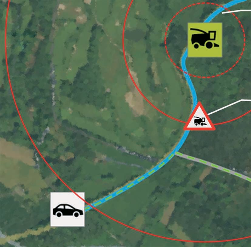 In response, Claas has developed its Telematics Large Vehicle Alert System – the first traffic safety system that proactively informs drivers of networked cars on the position and status of agricultural machines on their route.