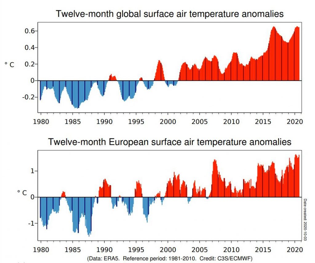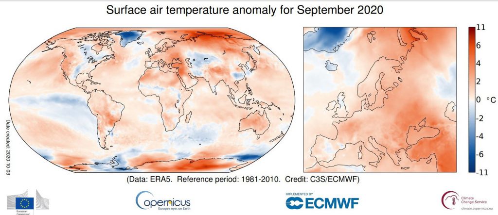 September 2020 was the warmest September on record in Europe and across the world, with the global average 0.05° warmer than the previous warmest September in 2019.