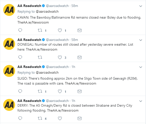 AA Roadwatch has reported flooding in counties Cavan, Donegal, Sligo and Derry, posting a series of updates on its Twitter page this morning.
