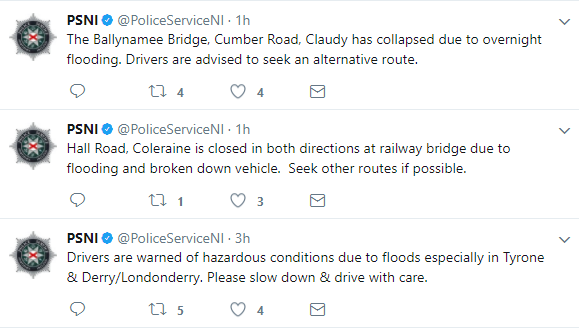 The police force also reports of the collapse of Ballynamee Bridge in Claudy, Co. Derry, due to the floods.