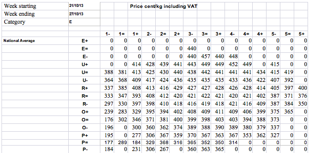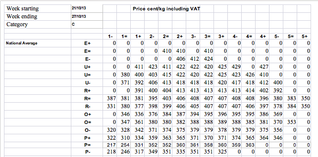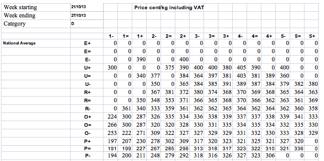 National Average Factory Prices for steers, cows, heifers for the week 21-27 October 2013, as reported by the Department of Agriculture.