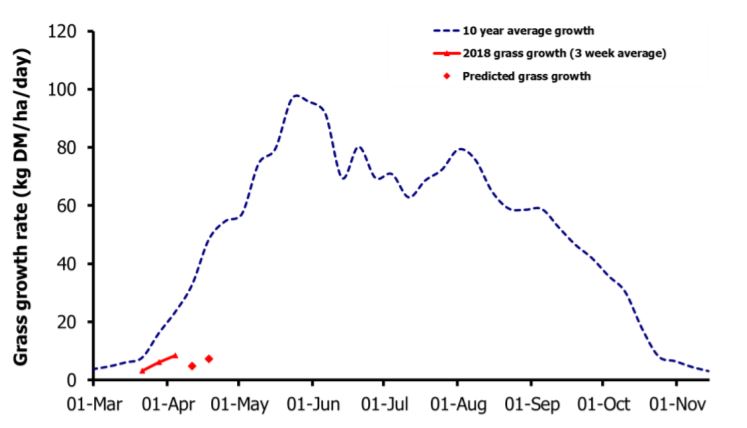 The same year, growth didn’t reach over 30kg DM/ha/day until early May when typically advisors on the programme would expect it to sit at around 80kg DM/ha/day.