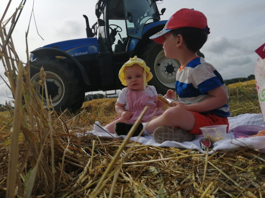 Darren Finegan sent in these shots of Colm Finegan Agri-Contracting in Leixlip, Co. Kildare, from the winter barley harvest below. The next generation of farmers were taking in the sights of the field.