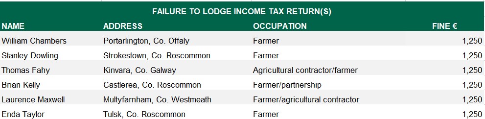 Similarly, Jeremiah Hennessy of Goresbridge, Co. Kilkenny, was fined €10,187 as a penalty determined by the courts in relation to an under-declaration of income tax.