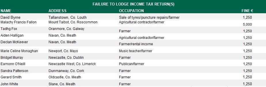 A number of farmers and contractors featured in a list of tax defaulters published by Revenue for the fourth quarter (Q4) of 2019 – with one farmer handed a fine to the tune of €88,780 for tax offences during this time frame.