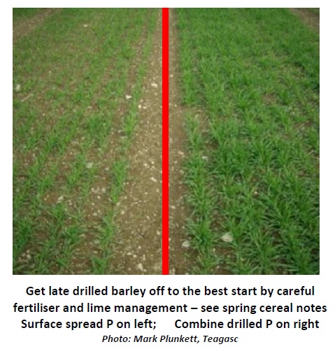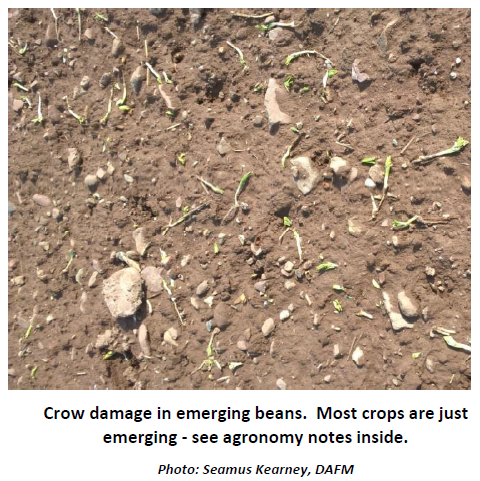 Early drilled wheat, barley and oats are just emerging. Nationally, it is estimated that close on 70% of spring barley is yet to be drilled. It is very late for spring oats and spring wheat but the 2/3 crop rules need to be taken into account before deciding not to plant.