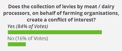 Surprise; surprise: 84% of those who participated in our most recent poll affirmed their belief that the collection of levies by meat/dairy processors on behalf of farming organisations does create a conflict of interest.