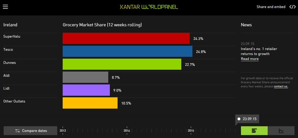 “Dunnes’ strong performance continues – shoppers now spend almost €50 more than they did last year, thanks largely to the ‘Shop and Save’ campaign. The retailer continues to gain share in shopping trips worth over €100 and has benefitted from customers buying more items, with volume sales increasing by 5%.